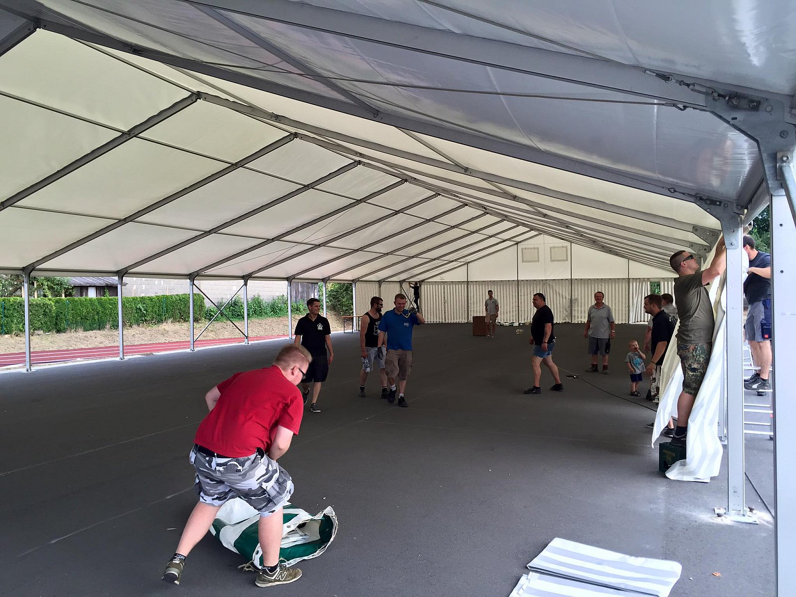 Es wurden 15 x 39 m und 8 x 15 m für die Bar gebaut! Zusätzlich lieferten wir noch eine Bühne für die Band's. Diesen Bereich haben wir mit lichtundurchlässigen Opak Planen versehen.